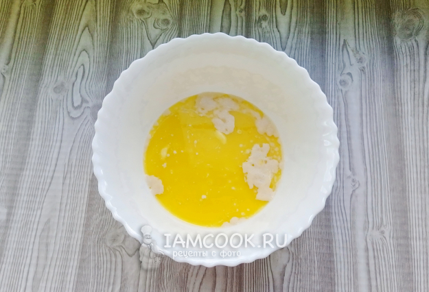 Сливочное масло растопите, немного охладите и влейте в миску с молоком, сахаром и дрожжами.