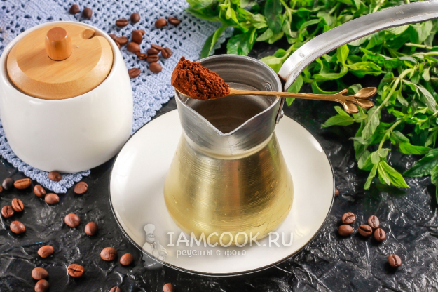 Сорт кофе выбирайте по своему вкусу. Всыпьте молотый кофе в турку и залейте горячей водой.