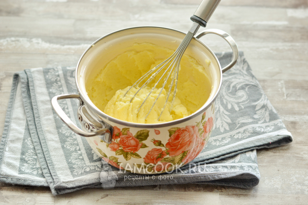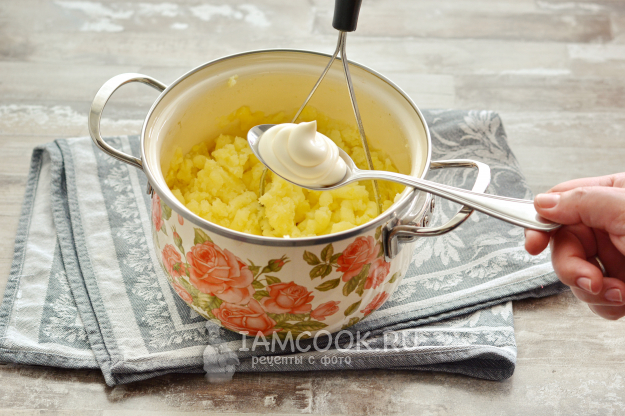 Растолките картофель тщательно толкушкой "насухую", то есть не добавляя жидкости. Как только весь картофель растолчён, добавьте майонез и продолжайте толочь его толкушкой. Вы увидите, как после добавления майонеза пюре меняет консистенцию и становится более вязким.