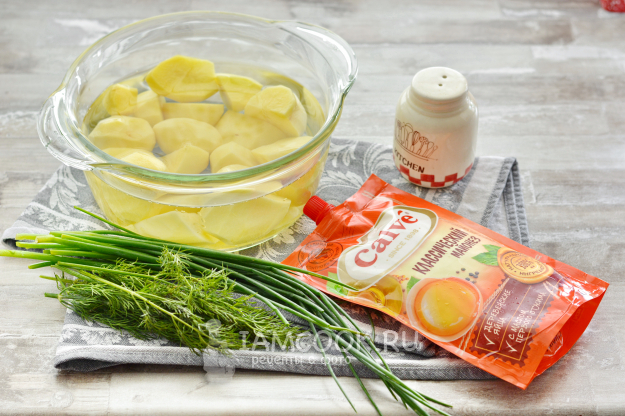 Возьмите все продукты для приготовления картофельного пюре с майонезом. Картофель очистите, сполосните под холодной водой. Крупные клубни разрежьте на 2-4 части. Чтобы картофель сварился равномерно, он должен быть порезан на куски одинакового размера.