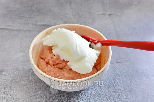 В отдельной миске взбейте в пену белки и вмешайте их лопаткой в общую массу.