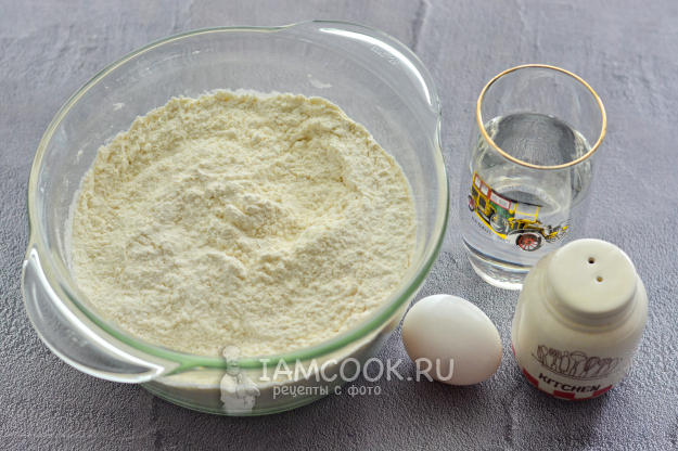 Отмерьте ингредиенты для приготовления вареников с квашеной капустой. Начнём с теста. Муку просейте в миску. Воду возьмите комнатной температуры. Яйцо хорошо помойте под теплой водой.