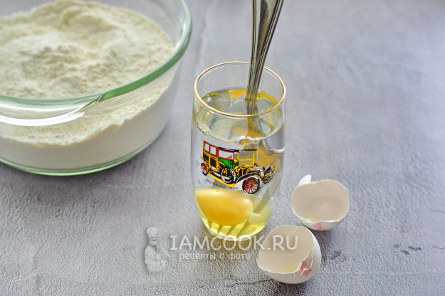 Взболтайте вилкой воду с яйцом и солью, влейте эту смесь в муку.