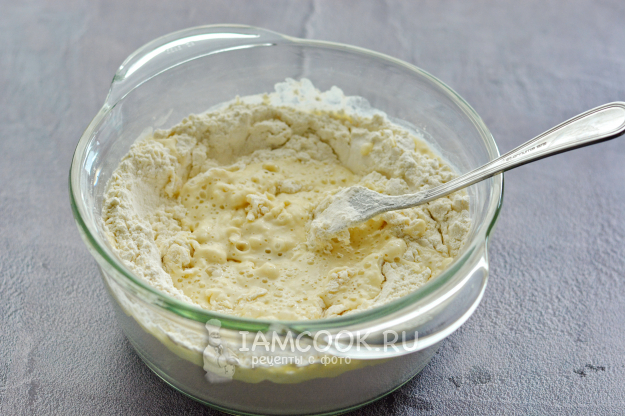 Начните вилкой замешивать тесто. Перемешивайте, пока не станут образовываться крупные хлопья.