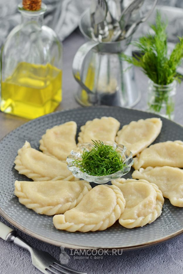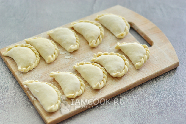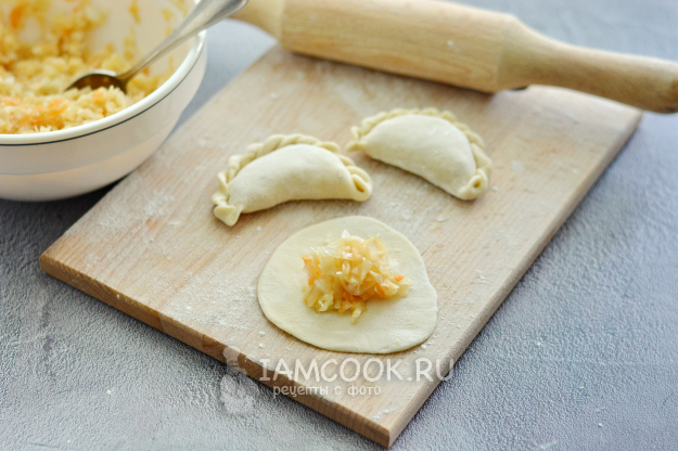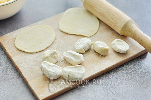На каждый кружок теста положите около чайной ложки начинки, края защипывайте очень тщательно, чтобы во время варки начинка не вываливалась. Можно залепить края "косичкой" для лучшего скрепления и красивого вида.