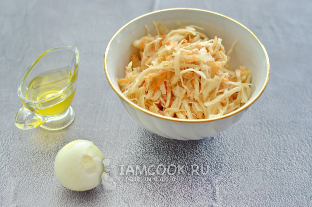 Подготовьте всё необходимое для начинки. Если квашеная капуста сильно кислая, то промойте её в сите или обдайте кипятком. Отожмите капусту от жидкости и мелко нарубите. Репчатый лук мелко нарежьте, добавьте к капусте, перемешайте и заправьте начинку нерафинированным подсолнечным маслом.