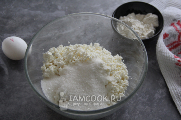 В миске соединить творог и сахар. Пробить массу погружным блендером, можно использовать миксер.