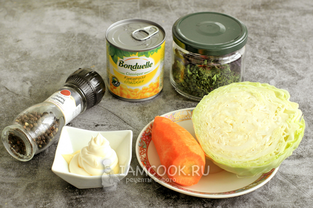 Все продукты для салата с капустой, морковью, кукурузой и майонезом - перед вами. Я использовала здесь сушеную зелень.