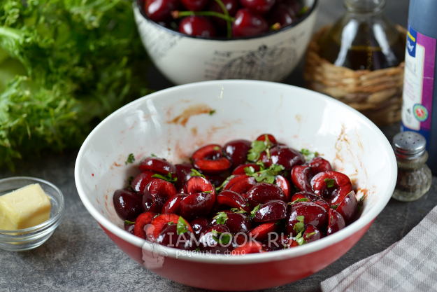 Первым делом нужно помыть, обсушить и очистить черешню от косточек. Лучше наденьте резиновые перчатки, поскольку пальцы и ногти могут сильно покраситься. Надрежьте каждую черешину, удалить косточку, переложите в глубокую миску. Порубите петрушку, всыпьте в миску. При желании вместо петрушки можно взять траву с более ярким вкусом, хорошо в этот салат подходят базилик и кинза. Заправьте черешню оливковым маслом и бальзамическим кремом, перемешайте, отставьте пока в сторону.