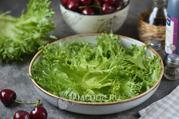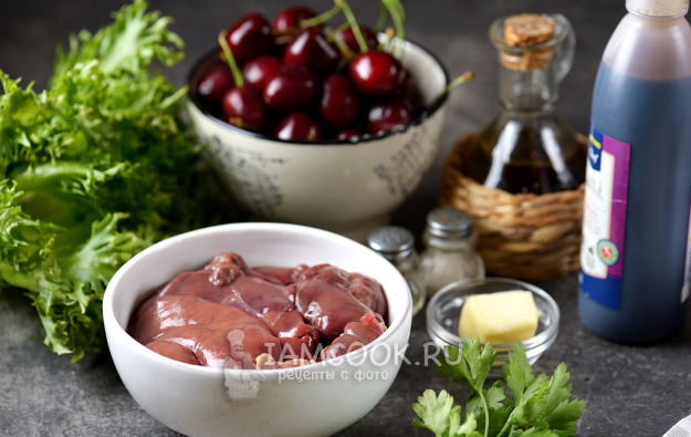 Подготовьте все продукты для салата с куриной печенью и черешней.