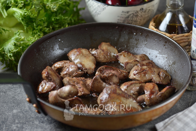 К столу салат с куриной печенью и черешней сразу же после приготовления.