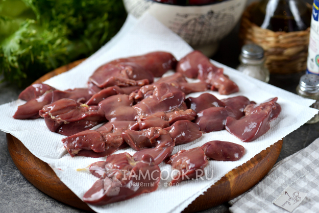 Печень помойте, срежьте все пленки и остатки жира, разрежьте пополам, обсушите насухо бумажными полотенцами.