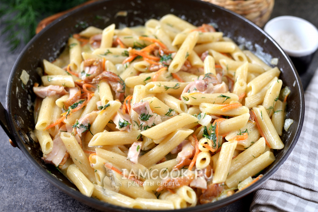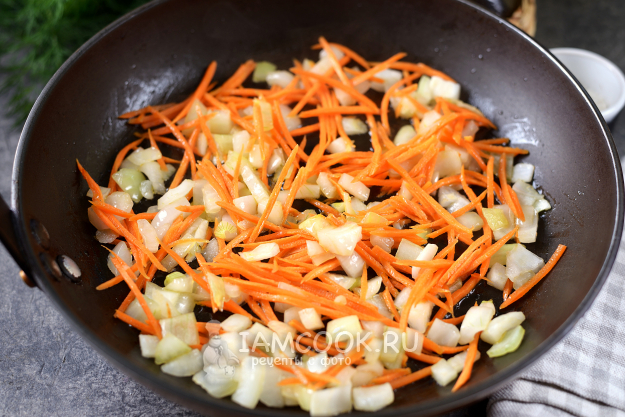 А пока варится паста, разогрейте в сковороде растительное масло, обжарьте в нем нарезанные репчатый лук и морковь до мягкости.
