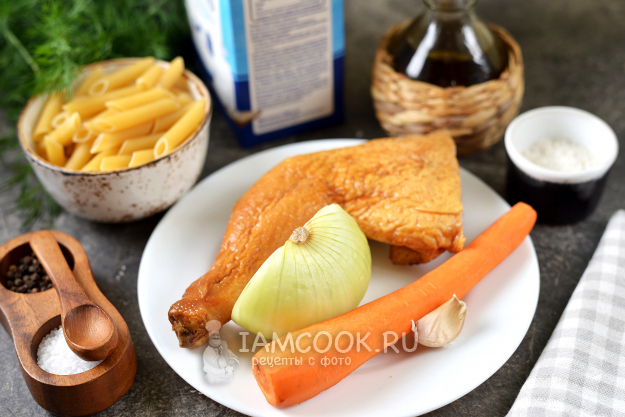 Возьмите все необходимые ингредиенты для приготовления макарон с копченой курицей. Репчатый лук и морковь почистите, помойте и обсушите.