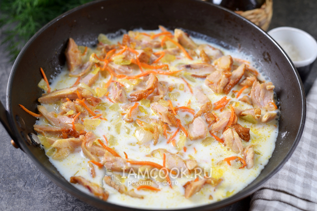 Влейте молоко, сразу же посолите и поперчите подливу, перемешайте.
