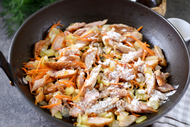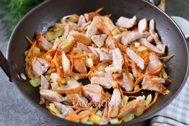 Срежьте копченое мясо с куриной ножки, нарежьте его тонкими ломтиками, переложите к овощам в сковороду, обжарьте около минуты.