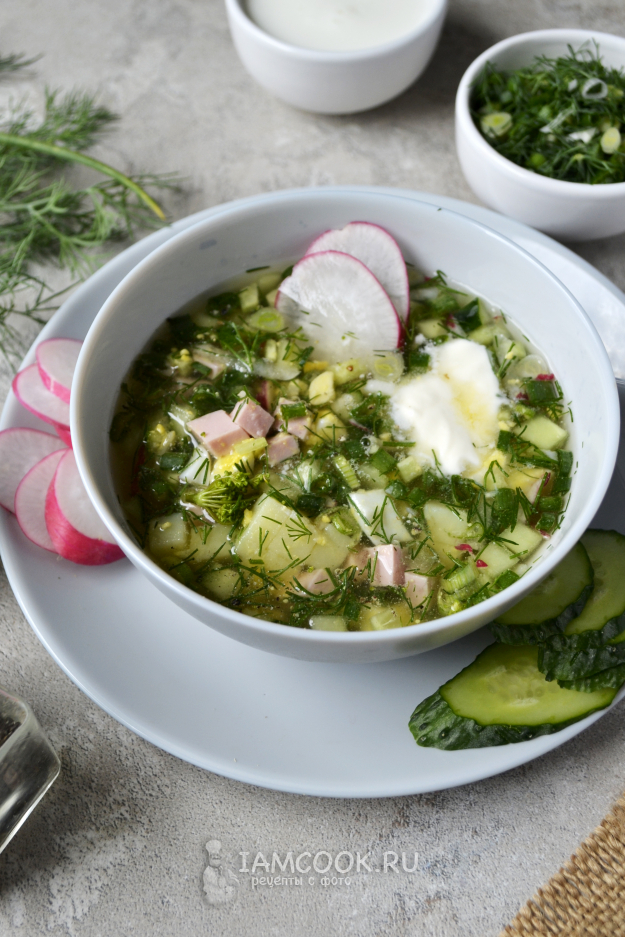 Возьмите все нужные ингредиенты для приготовления окрошки на рассоле от помидоров.