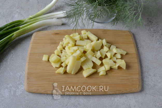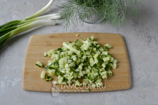 Огурец нарежьте так же, как и картофель. Если кожура плотная и жесткая, то очистите огурец.