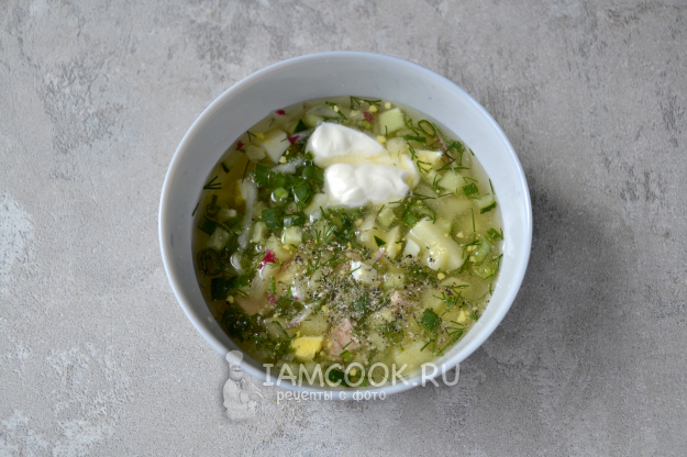Окрошка на рассоле от помидоров готова. Подавайте к столу и приятного аппетита!
