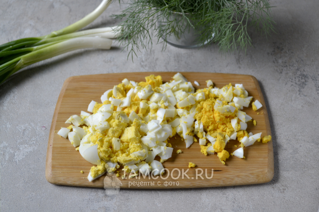 Яйца отварите, залейте холодной водой, очистите и нарежьте.