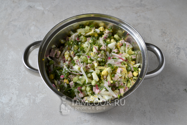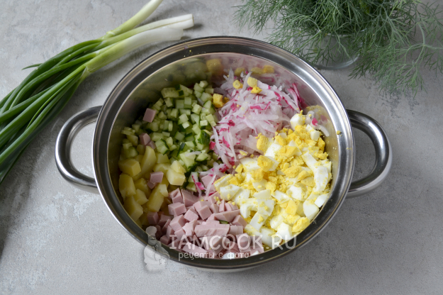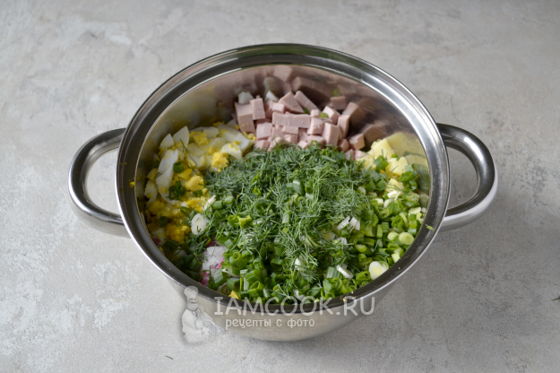 Все ингредиенты окрошки должны быть хорошо охлажденными и нарезаны одинаковыми мелкими кубиками.