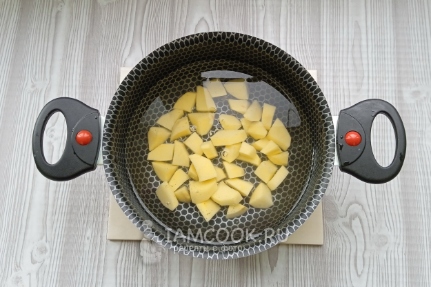 Картофель очистите, помойте и нарежьте. Выложите в кастрюлю и залейте водой.