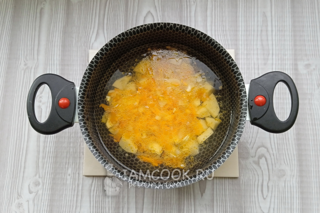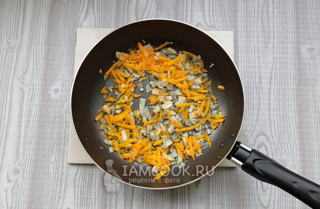 Морковь и репчатый лук очистите, помойте. Лук мелко нарежьте, а морковь натрите на терке. Выложите овощи в сковороду и налейте рафинированное подсолнечное масло. Пассеруйте лук и морковь на среднем огне 5-6 минут перемешивая.