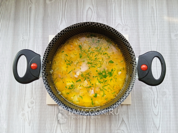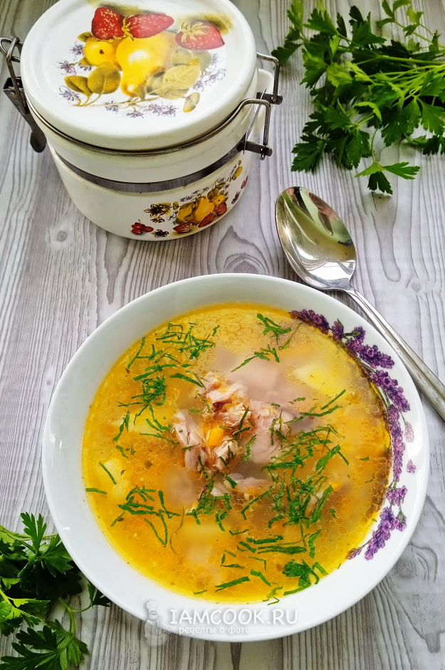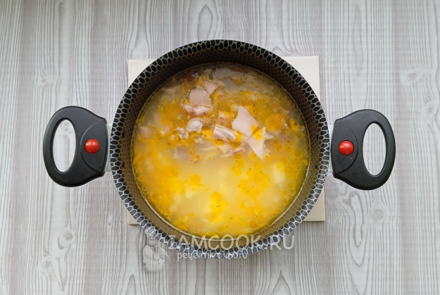 Когда суп будет готов, добавьте в кастрюлю копченую курицу.