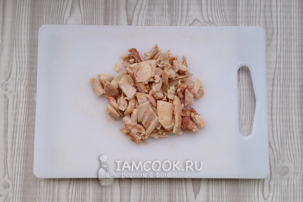 Пока суп варится, копченую курицу (грудку или окорочка) нарежьте небольшими кусочками.