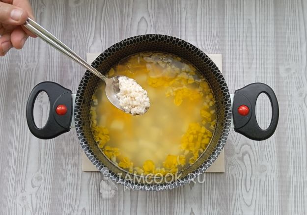 Через 15 минут добавьте в кастрюлю рис, который предварительно помойте. Суп посолите и поперчите по вкусу.