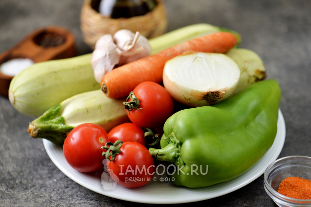 Возьмите все необходимые продукты для приготовления тушеных кабачков с овощами в духовке. Все овощи помойте, почистите лук, морковь и чеснок.