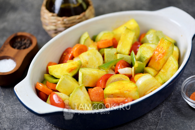 Спустя время аккуратно снимите фольгу, перемешайте овощи в форме деревянной лопаткой и переложите их в тарелку для подачи.