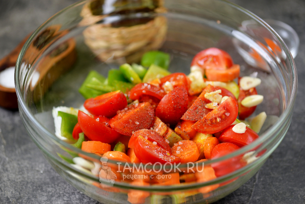 Всыпьте соль и перец по вкусу, добавьте оливковое масло и любимую овощную или куриную приправу, тщательно все перемешайте.