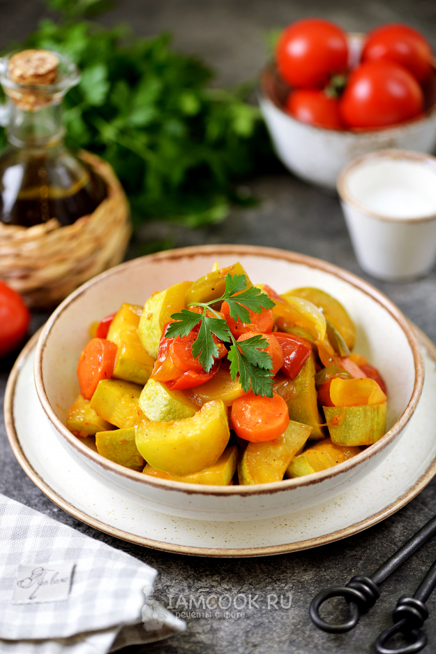 Подавайте тушеные кабачки с овощами в качестве гарнира сразу же после приготовления.
