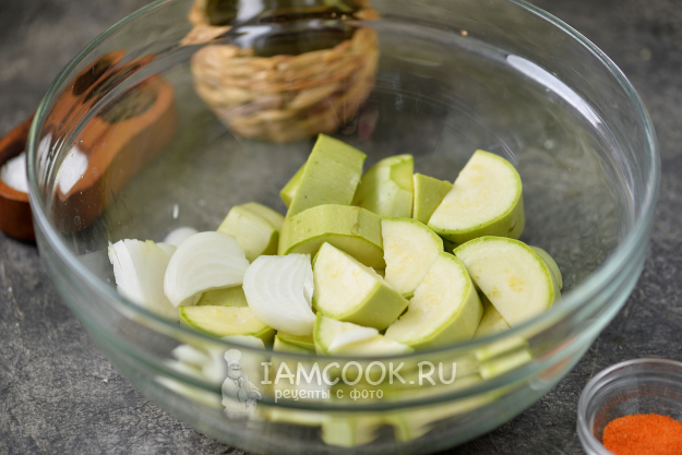 Кабачок и лук нарежьте крупными ломтиками, переложите в глубокую рабочую миску.