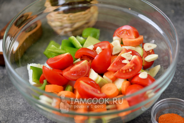 Переложите овощи в форму для запекания, налейте немного воды из чайника.