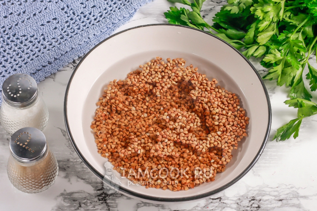 Возьмите необходимые ингредиенты для приготовления гречки с майонезом.