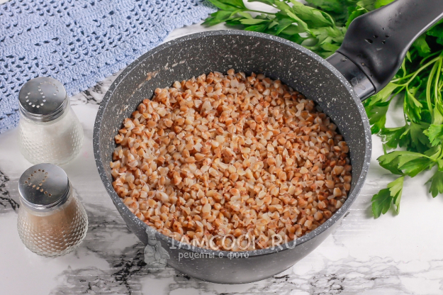 Затем нагрев выключите, перемешайте кашу и накройте крышкой емкость. Дайте гречневой каше пропариться примерно 5-10 минут. Кстати, по желанию можно сначала отварить гречку, а потом вмешать в нее майонез, но мне первый вариант по вкусу нравится больше!
