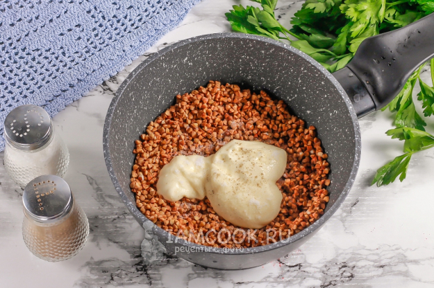 Вскипятите воду в чайнике. Всыпьте промытую крупу в ковш или казан, кастрюлю с антипригарным дном. Добавьте майонез любой жирности, соль и молотый черный перец. На этом же этапе допустимо добавить и приправы.