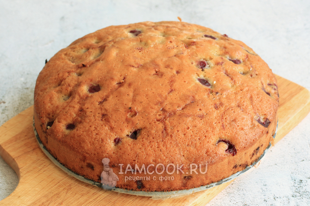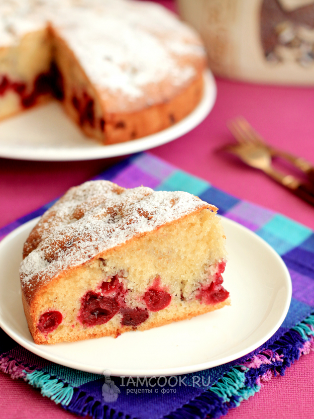 Готовность проверьте шпажкой, она должна выходить из пирога сухой. При подаче простой пирог с вишней на сметане можно посыпать сахарной пудрой.