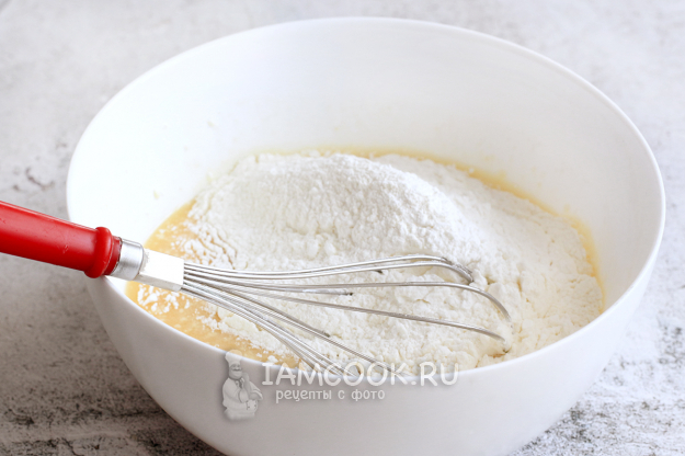 Теперь добавьте просеянную сухую смесь и снова все смешайте ручным венчиком. Тесто получается не густым, а даже жидковатым.