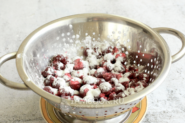 Вишню посыпьте крахмалом (10г) и аккуратно перемешайте. Она готова к использованию. Вместо вишни можно использовать любые ягоды по этому же принципу.