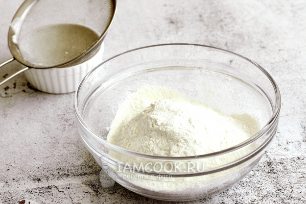 Просейте муку, крахмал (любой) и разрыхлитель в отдельную емкость. Если используете вместо ванильного сахара ванилин, то и его добавьте сюда же.