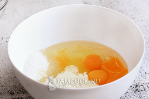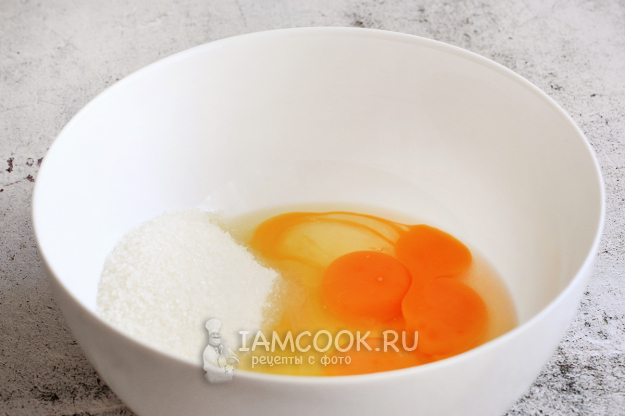 Соедините яйца, щепотку соли, ванильный сахар и обычный сахар.