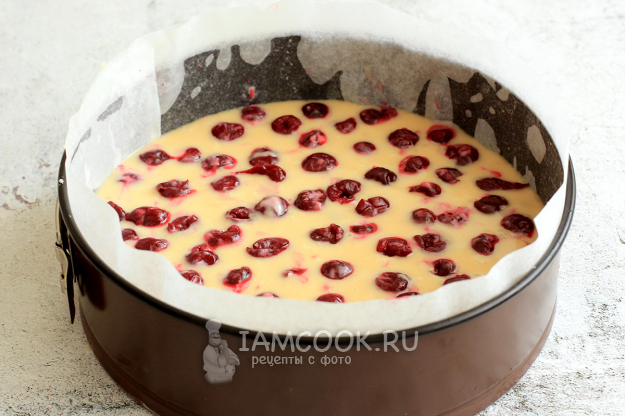 На дно формы вылейте половину теста и распределите по тесту половину всей вишни. Затем вылейте остальное тесто и распределите оставшуюся вишню.