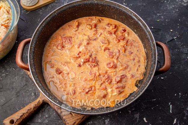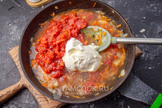 В оставшиеся обжаренные овощи добавьте консервированные томаты кусочками, сметану и воду.