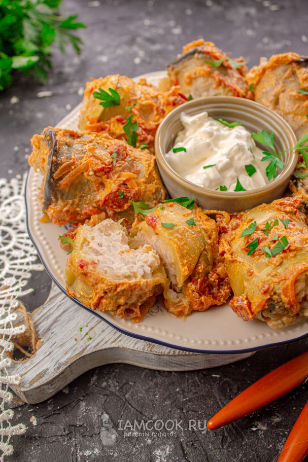 Готовые рулетики подавайте горячими со сметаной. Приятного аппетита!!!