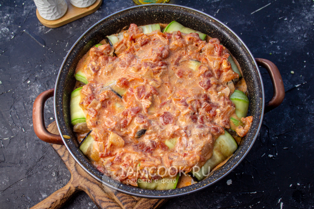 Залейте отложенным соусом. Доведите до кипения, сделайте минимальный нагрев и тушите фаршированные баклажаны и кабачки под крышкой 25-30 минут.
