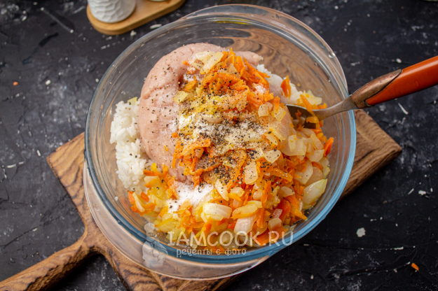 В подходящей миске соедините отварной рис, фарш и половину обжаренных овощей. Посолите и поперчите, тщательно перемешайте.