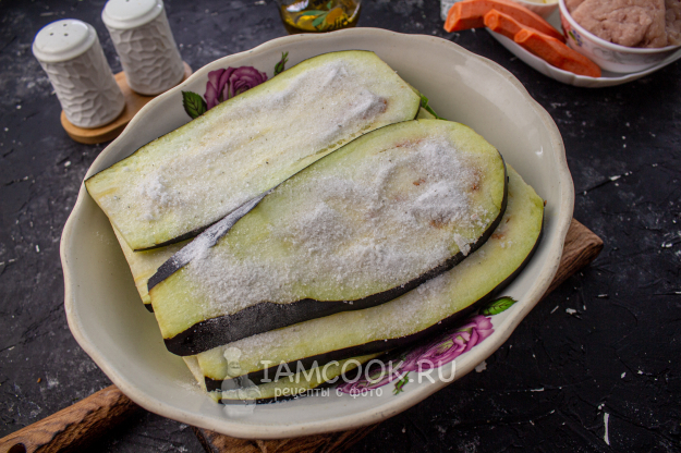 Кабачок и баклажан нарежьте тонкими длинными полосками. Для того чтобы из полосок баклажанов и кабачка можно было скрутить рулетики, их надо сделать более мягкими. Есть несколько способов: например, обжарить их на гриле, запечь в духовке или хорошо просолить, оставив на некоторое время. Я воспользовалась последним вариантом.